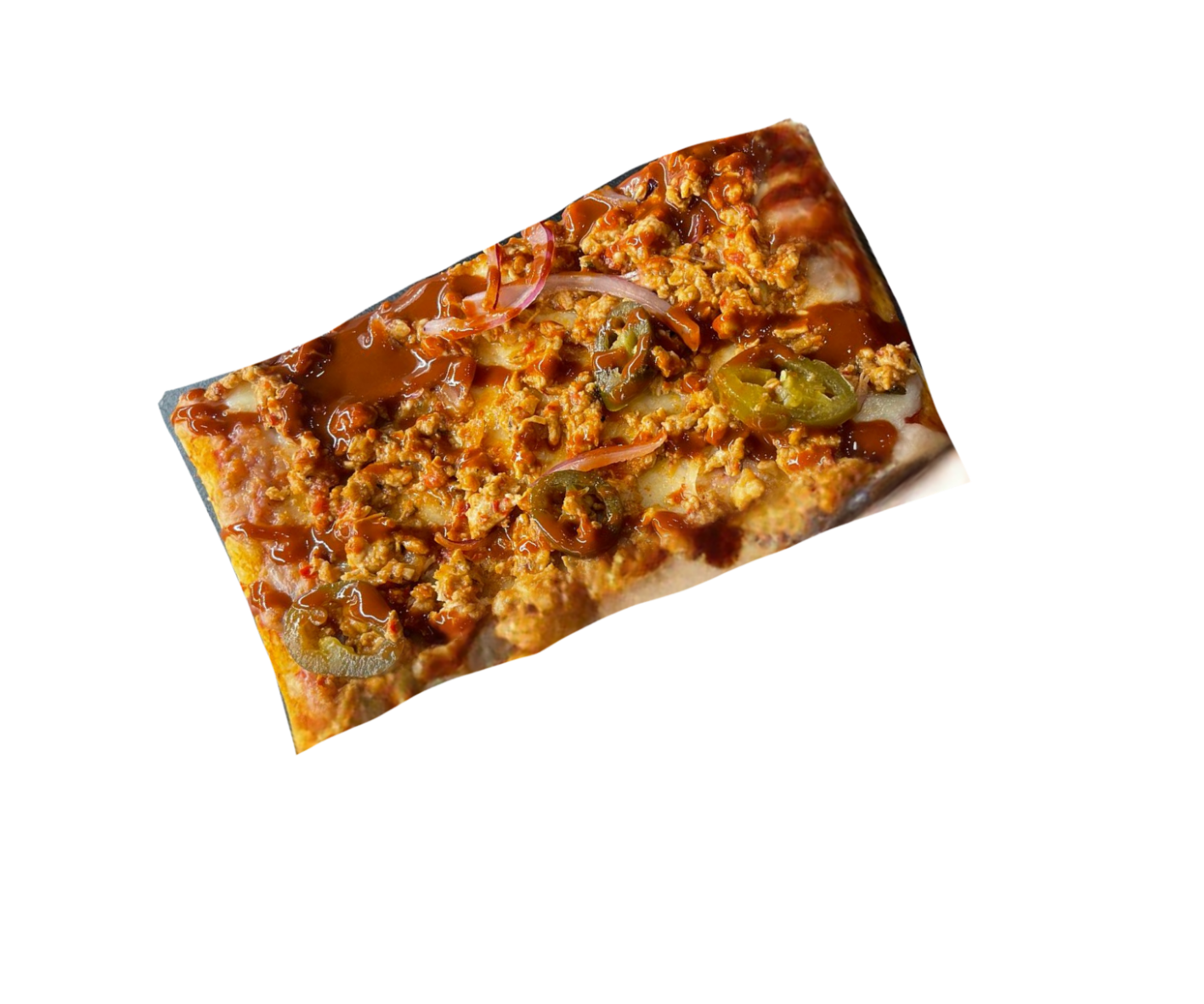 MOZZARELLA, POLLO, CEBOLLA MORADA , JALAPEÑOS Y SALSA PICANTE.