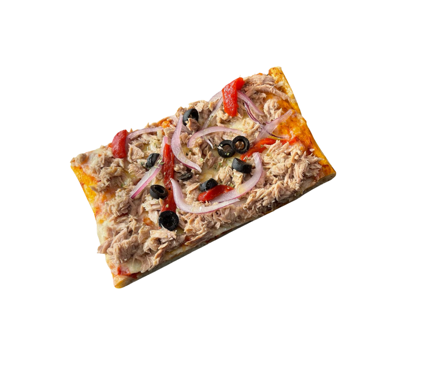 MOZZARELLA, ATUN, CEBOLLA MORADA , PIMIENTOS, OLIVAS NEGRAS.